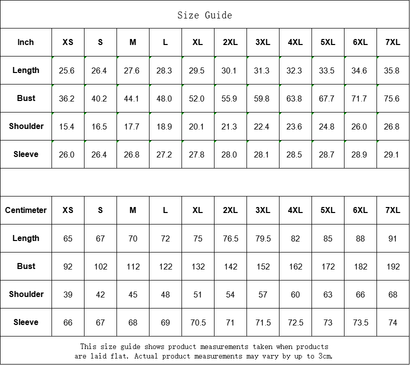 | Centimeter | XS | S | M | L | XL | 2XL | 3XL | 4XL | 5XL | 6XL | 7XL |